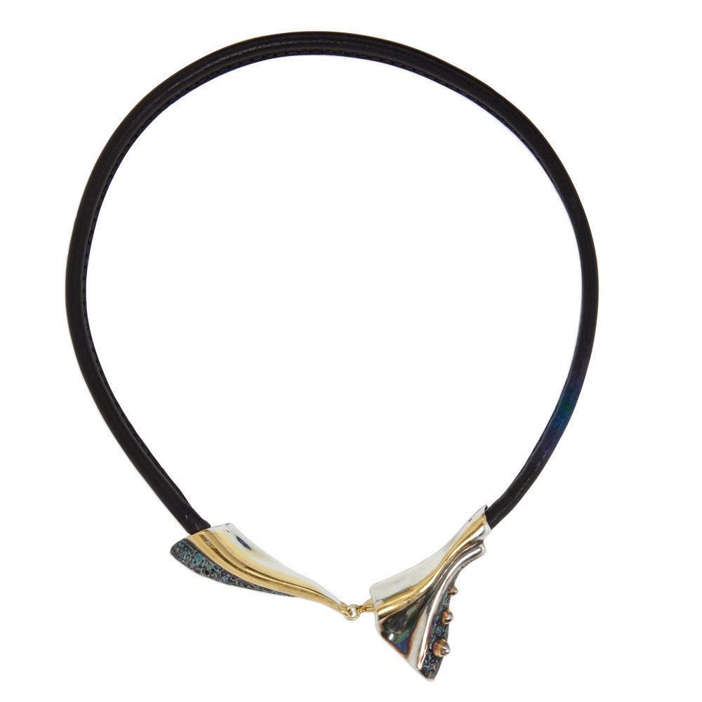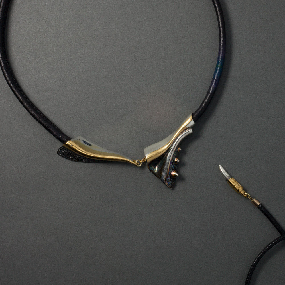 METALLIC FOLD ON INDIGO LEATHER NECKLACE.